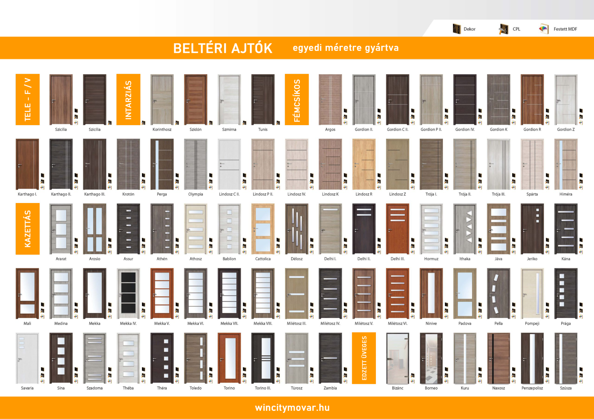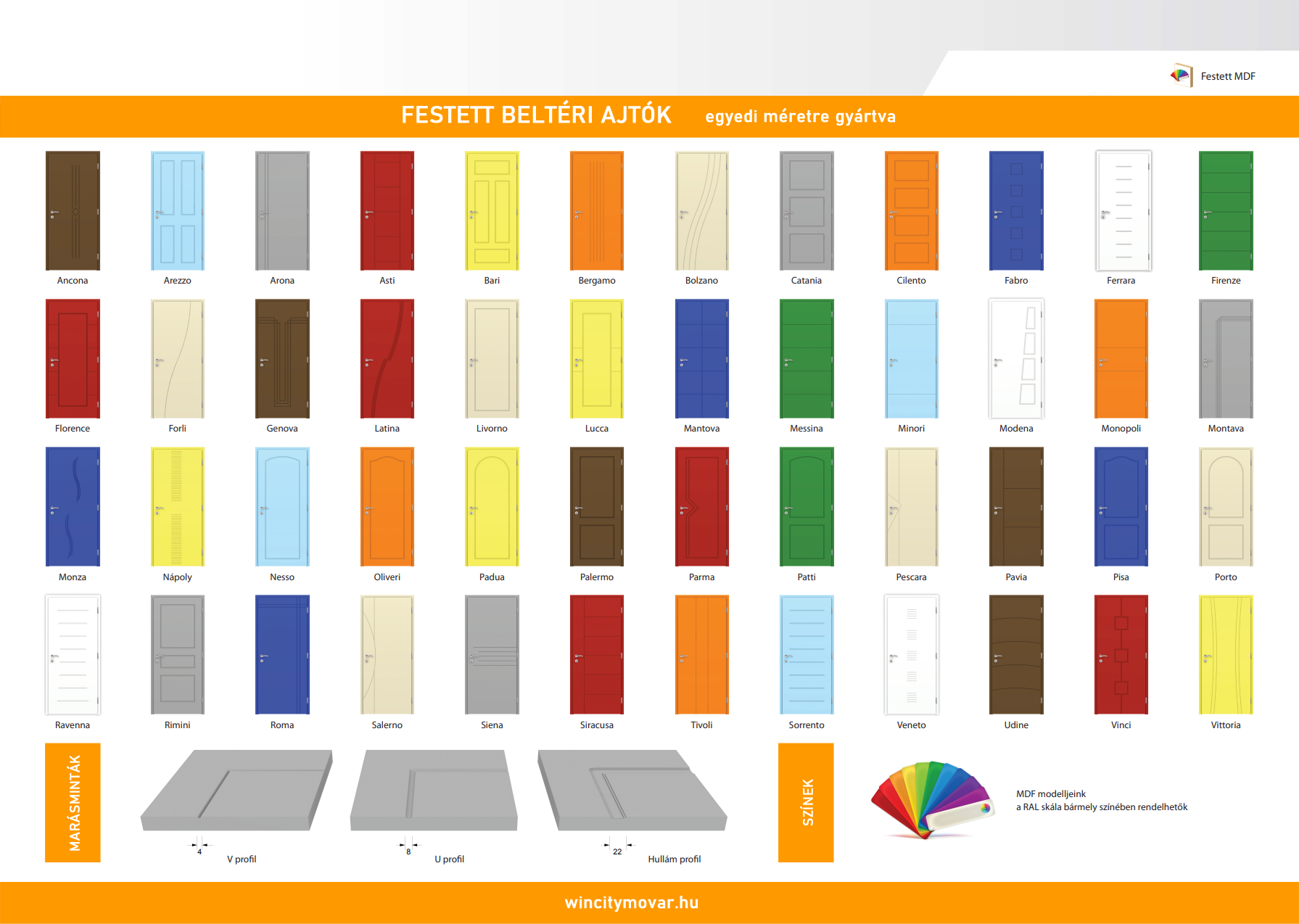 Festett ajtók esetén a tok és az ajtólap is festett felületű. Színe a RAL színskálából választható.