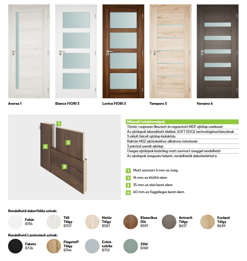 Tömör mdf vagy papírrács lapszerkezetű ajtólap kivitel szerint.